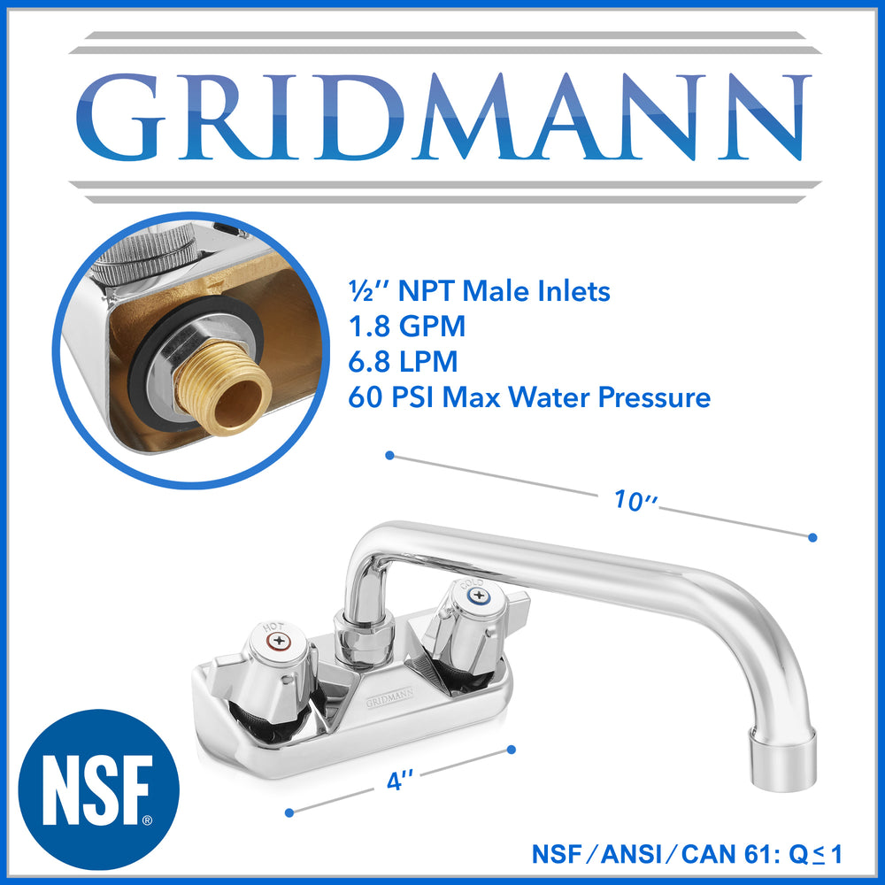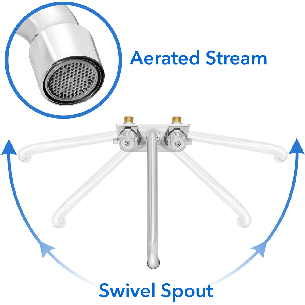 - Commercial wall mount faucet: This standard-size commercial faucet with a 4" center and a 10" swing spout features brass construction with a polished chrome plated finish for durability and corrosion resistance. The 360-degree swivel spout is designed with reinforced double O-ring valves.