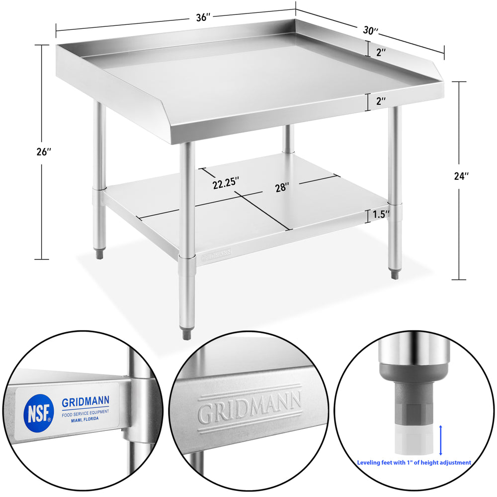 - Heavy-duty, built to last: GRIDMANN’s equipment stand features a 16-gauge, 430 stainless steel top shelf that can support up an impressive amount of evenly distributed weight. The 24" work surface height makes this the perfect prep table to hold grills, griddles, mixers, slicers, beverage dispensers, slushy and ice cream machines.