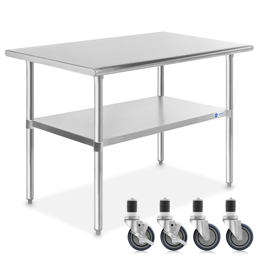 This heavy-duty table by GRIDMANN is constructed from 18-gauge #430 stainless steel, and is the perfect work surface for use in a kitchen, bar, restaurant, laundry, school, hospital, or any other commercial setting. It is NSF certified to meet strict standards for public health protection and built for high-volume use to last a lifetime. This stainless steel table features an extra heavy-duty top, an adjustable-height galvanized under-shelf, and galvanized legs with adjustable non-marring feet that eliminate table wobble on uneven floors. The edges on the front and back of the tabletop are rounded for working comfort. This table also includes four caster wheels designed for Gridmann stainless kitchen prep tables but will fit any legs with a 1-1/2" diameter opening. The composite 4 inch wheel is chemical resistant and built for use in the commercial kitchen environment. Each wheel is rolls smoothly and they easily pivot on a full set of ball bearings. The wheels are non-marring and work on almost any solid surface. Two of the wheels include brakes that can be locked down to keep your table in place. Some assembly required.